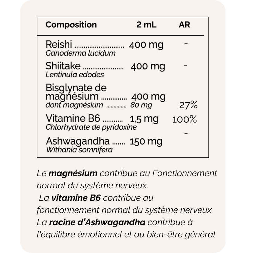 Eau purifiée, glycérine végétale*, extrait de corps fructifère de reishi* (Ganoderma lucidum), extrait de corps fructifère de Shiitake* (Lentinula edodes), bisglycinate de magnésium, vitamine B6 (Chlorhydrate de pyridoxine), poudre de racine d’Ashwagandha* (Withania somnifera).